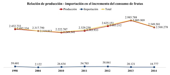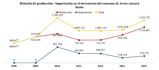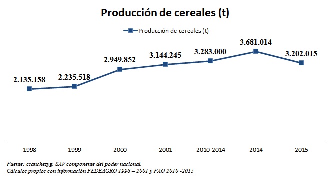Estos resultados que colocaron a la población venezolana como constituyente de su poder nacional, en uno de los más altos niveles en cuanto a indicadores, en materia de alimentación en el mundo, fueron acompañados por un proceso de incentivo a la producción nacional que parte por, la incorporación de tierras ociosas a la producción agropecuaria, según su vocación de uso. Por lo tanto, también se puede evidenciar, independientemente de las posiciones encontradas entre los juegos de intereses en el sector agroalimentario, que se impactó en la producción primaria nacional, incrementando las hectáreas de siembra, pasando de 1.638.295[32] hectáreas en el año 1998 a 3.400.000 hectáreas cultivadas ya para el año 2012[33], que corresponde a un incremento de la superficie de un 107 %; de igual forma, evolucionó el aumento de un poco más de 2.000.000[34] t a más de 3.000.000[35] t al año, sólo de cereales, siendo este, uno de los sectores más importantes de la dieta nacional, justificado con la incorporación de tierras aprovechables (ver Gráfica 1).