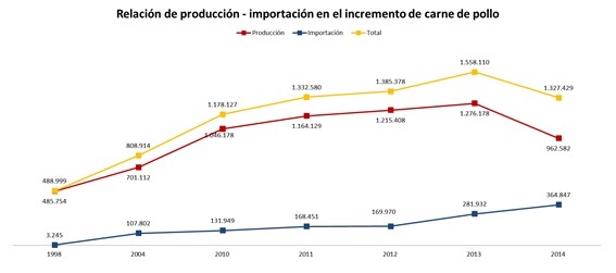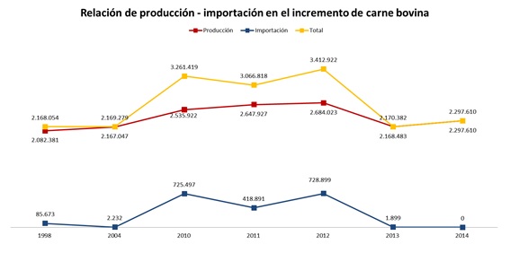 En cuanto al crecimiento del rebaño nacional, fue de un 55 %. En el año 1.998, oscilaba en aproximadamente 10.000.000 de cabezas, el cual ascendió a 12.904.130 cabezas, según censo agrícola del año 2.008, superaba las 14.200.000 cabezas entre el 2011 y 2014 según el Ministerio de Agricultura y Tierras, y crecieron a 15.508.097[37] animales en el 2016. Sumado a esto, y no es para menos, porque son resultados dependientes de las acciones llevadas a cabo, aumentó el consumo de carnes (bovina, pollo y cerdo) a 82,1 kg/per/año (Ver Gráfica 2), correspondiente a un incremento del 30%. Sin embargo, uno de los elementos de importancia a resaltar es, que del total de carne de bovina que se consumía, el 70 % era de producción nacional, según el BCV, mientras que aún se importaba el 30 %, para cubrir el aumento del consumo como se contempla en la Ley de Seguridad y Soberanía Agroalimentaria del año 2008.