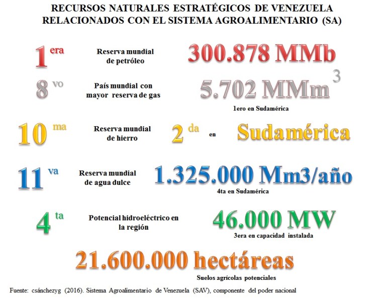Así como ahora, contra Venezuela todas las opciones estratégicas están sobre la mesa, incluyendo la intervención militar por parte de EEUU[1]; el presidente Chávez en 1999, sin mucho alarde de su estrategia también desplegó las suyas, en relación a los recursos naturales de esta nación, entendiendo que existe una carrera mundial por éstos, entre los diferentes actores del sistema internacional, para la obtención a como dé lugar de ellos, y no perder su estatus de crecimiento, desarrollo y consumo, llámense EEUU, China, Rusia, Alemania, España, Brasil u otro, incluyendo empresas transnacionales; y tomando en consideración que, la economía venezolana se basa principalmente en la explotación petrolera como motor esencial de todo su sistema, y del mundo; por ser además, “la primera reserva mundial de petróleo; pero también el octavo país con mayores reservas de gas y primero en Suramérica; la décima reserva de hierro y la segunda en Suramérica, la onceava reserva de agua dulce del mundo y cuarta en Suramérica; así como la cuarta en potencial hidroeléctrico en la región y tercera en capacidad instalada, entre otros atributos por desarrollar como la tierra cultivable”[2](ver imagen 1); aplicó una serie de políticas estatales sobre el control soberano de los recursos naturales, que impactaron directamente en el sistema agroalimentario nacional, y aunque fue detonante de conflictos con los sectores oligopólicos nacionales transnacionalizados y transnacionales, buscaba impulsar un aparato productivo alterno en sectores estratégicos, como los alimentos.