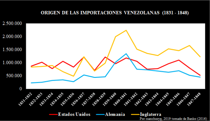 Son Estados Unidos, Gran Bretaña y Alemania quienes durante el período de 1831 – 1848, controlan las exportaciones e importaciones de productos desde Venezuela, observándose el papel preponderante de EEUU durante estos años, como destino de las exportaciones venezolanas (ver imagen 1).