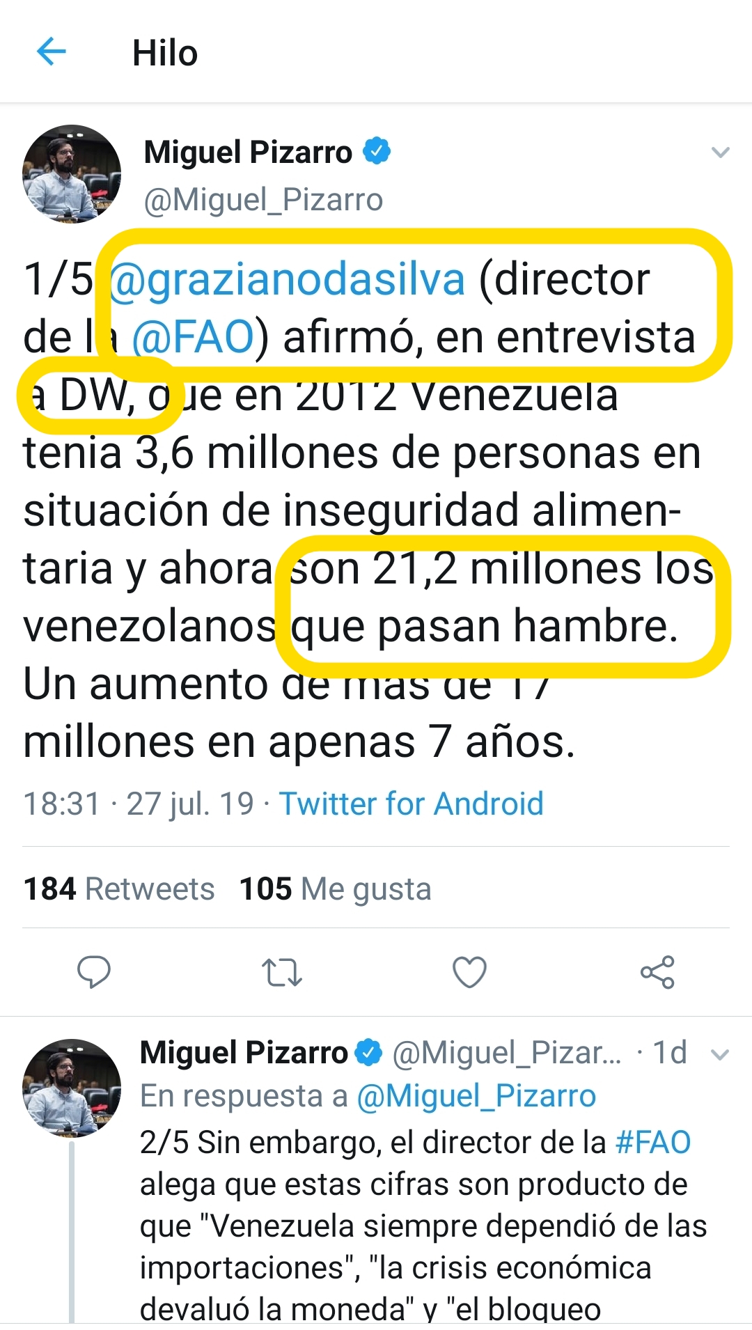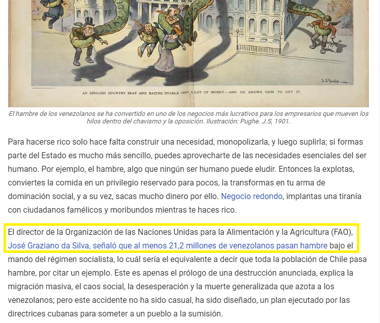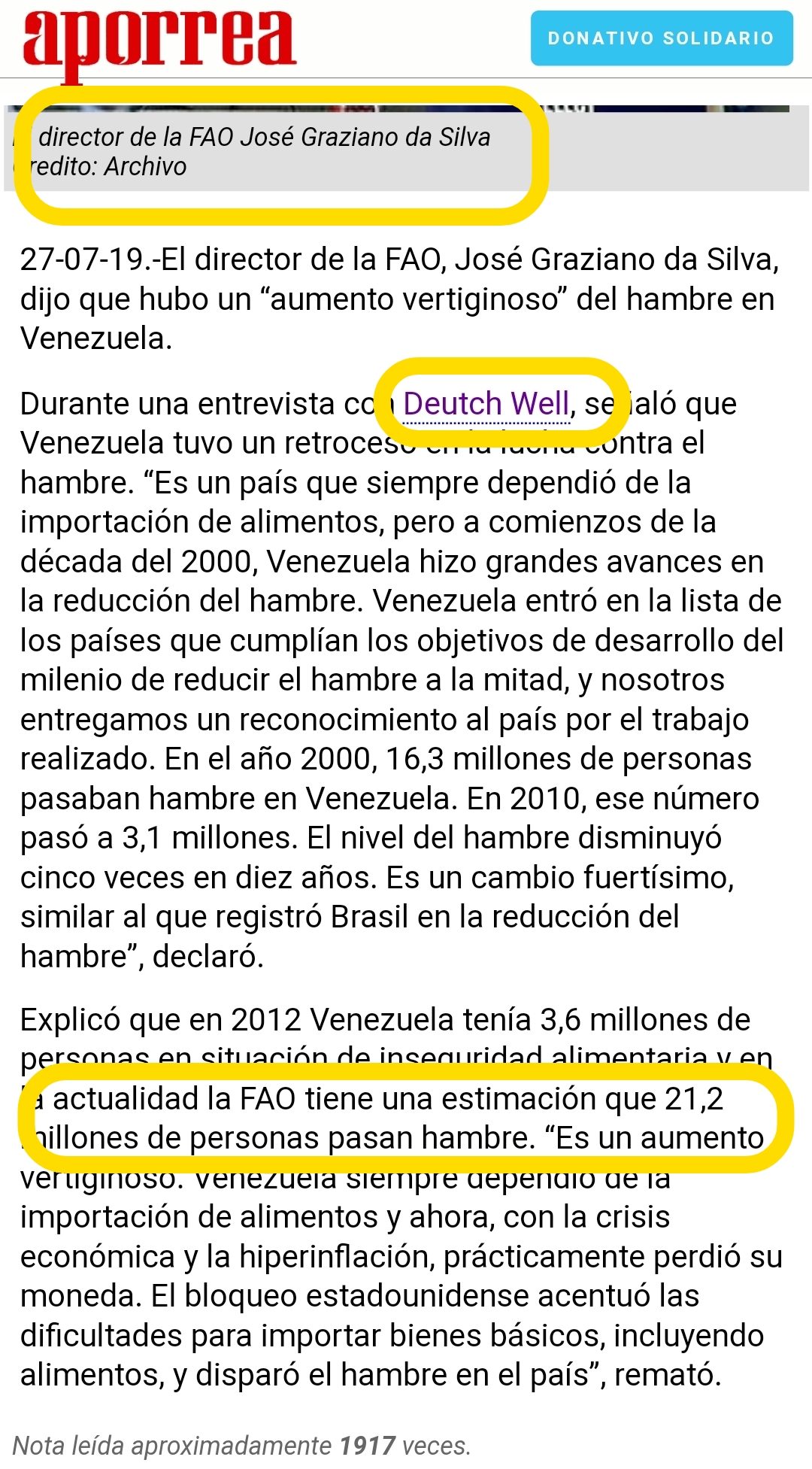 Muestra de ello es la manipulación mediática que hizo Deutch Well[7] de las cifras de la FAO y la entrevista que le diera su saliente Director general, difundiendo que 21,2 millones de personas padecían hambre, o sea, triplicaron la cifra (adicionaron 14,2 millones de personas a las 6,8 millones) (ver imagen 2,3 y 4), replicándose durante 2 días contra Venezuela como cierta, y después corrigieron la misma como si nada pasó, después del daño causado, mostrado en las réplicas[8], sin embargo, es preciso mencionar un dato relevante, el reconocimiento de que «el bloqueo estadounidense, acentuó las dificultades para (…) importar alimentos, y disparó el hambre en el país»[9] (ver imagen 5).