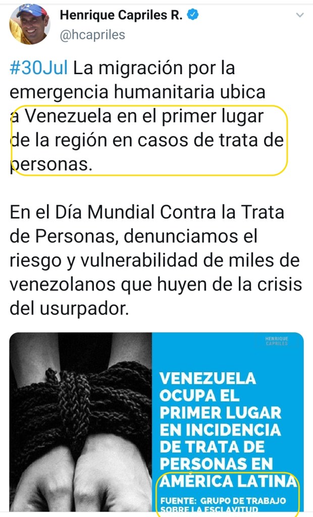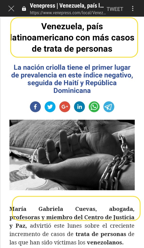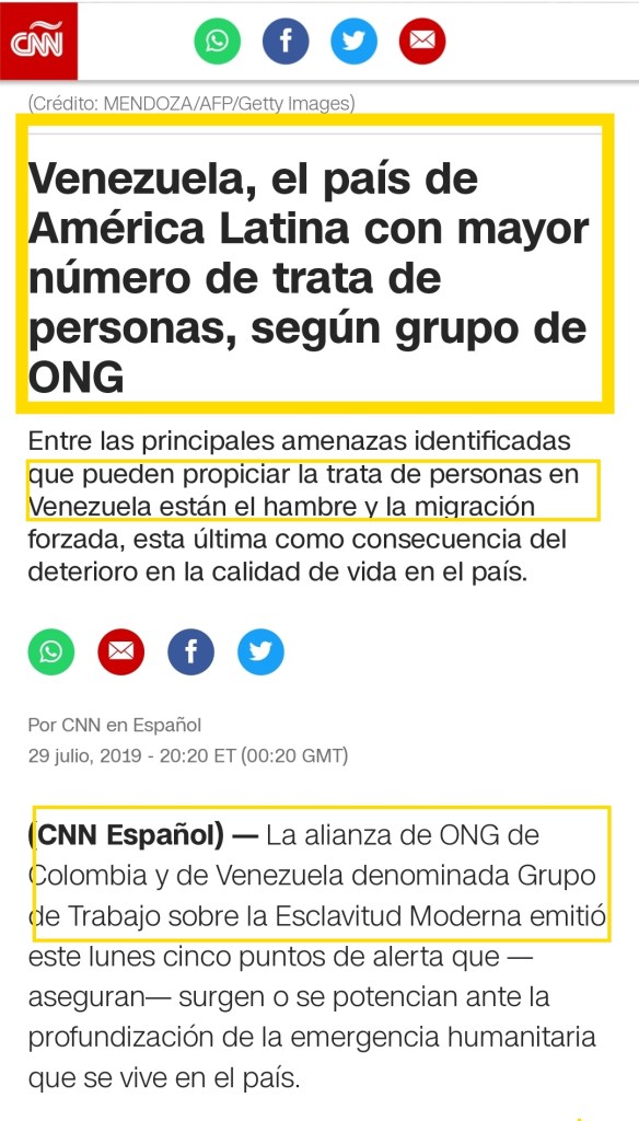 El tercer ejemplo, es tan reciente cómo el anterior. En vista que llegó el Día contra la trata de personas, convertir a Venezuela en el primer país con este flagelo en Latinoamérica, no se hizo difícil para CNN[11] (ver imagen 8, 9, y 10), una ONG colombiana y algunos expertos investigadores claramente opositores al gobierno nacional, sin contar con cifra alguna que así lo confirme. No la tienen. La causa, el hambre y la migración.