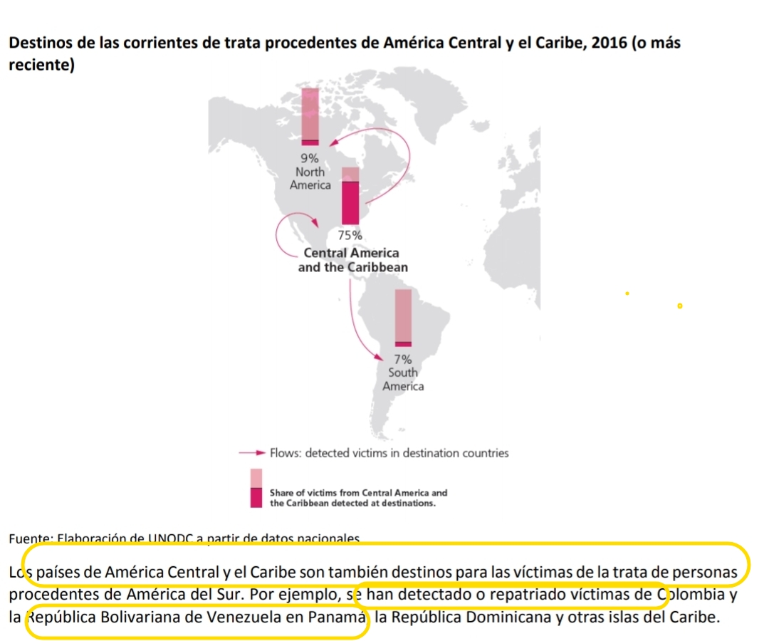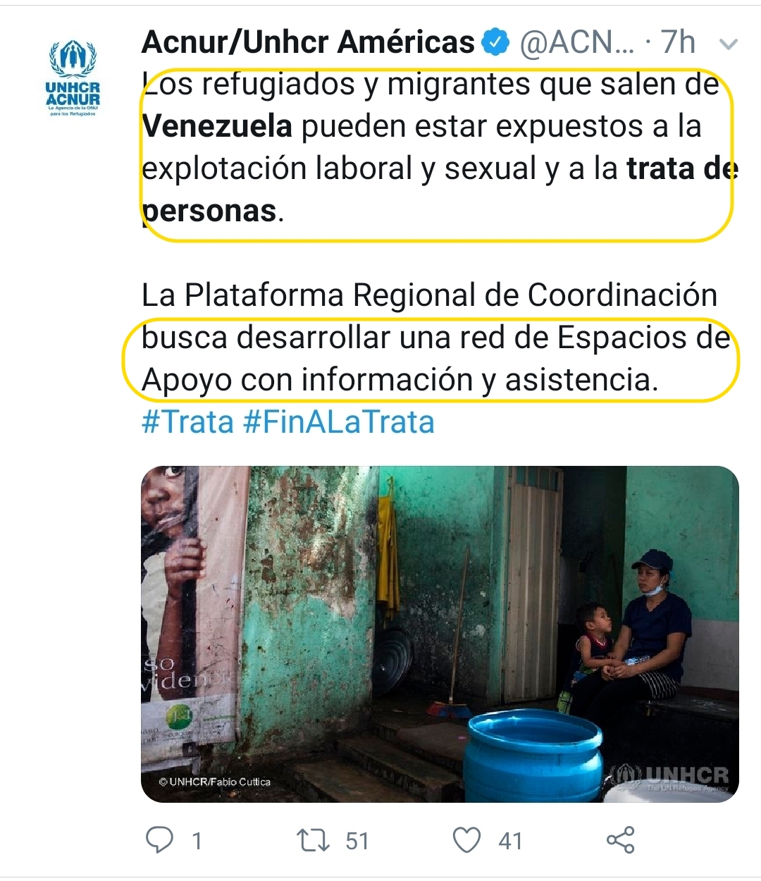 Según el último Informe Global sobre trata de personas publicado en 2018 por UNODC[12], este flagelo aumenta en zonas de conflictos armados sobre todo en Siria, Irak, Afganistán. La región con más niños víctimas es América del Norte, Centroamérica y El Caribe. En cuanto a, Sudamérica se menciona que el 80 % de las víctimas son mujeres para explotación sexual; seguido por el trabajo forzado con altas tasas en Argentina y Paraguay; y de niños víctimas en Bolivia y Perú. Los países con mayores reportes son Argentina que reciben victimas de Paraguay y Bolivia; Ecuador que recibe en su mayoría de Colombia; Brasil y Chile que reciben de Bolivia y Perú; y Perú que recibe de varios países. En relación a Venezuela sólo menciona UNODC, que se detectó víctimas en Panamá como país destino, de la región América Central y el Caribe (ver imagen 11). Si días atrás, manipularon cifras de FAO, ahora anunciaron unas que no tienen, no existen. Sin embargo, de forma discreta ACNUR (ver imagen 12) se sumó y prestó para iniciar la construcción del relato que justifique más bloqueo y sanciones contra Venezuela.
