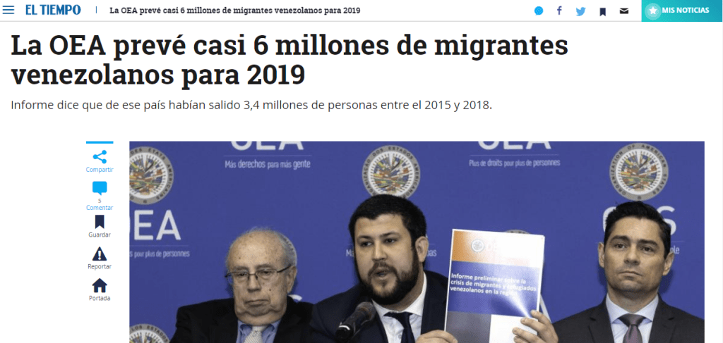 [4] El tiempo. (2019). La OEA prevé casi 6 millones de migrantes venezolanos para 2019. Recuperado el 02 de 08 de 2019, de https://www.eltiempo.com/mundo/venezuela/hasta-casi-6-millones-de-venezolanos-saldran-del-pais-en-2019-335880