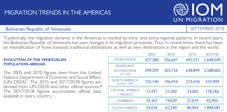 Imagen 1. Datos sobre la migración de la República Bolivariana de Venezuela, en el Informe de la Organización Internacional de Migraciones de Septiembre 2018.