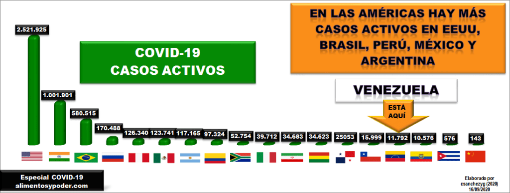En cuanto a casos activos, en relación a los contagios totales, Brasil sigue teniendo la mayor cantidad, con más de 580.000; seguido de Perú con más de 126.000; México con más de 123.000; Argentina, con más de 117.000 casos superó a Colombia, con más de 97.000. Y aunque en Chile disminuyen después de tanto, la cantidad de contagios se mantiene, en alrededor de 16.000 casos; y Venezuela que supera los 11.700.
