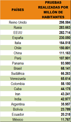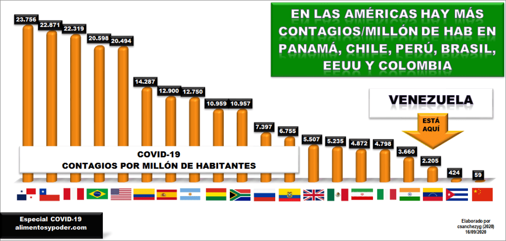 Mientras que en Venezuela, los casos de contagios por millón de habitantes alcanzan un poco más de 2200; en Panamá, Chile, Perú y Brasil, se tienen más de 23.000, 22.000 y 20.000, respectivamente. Incluso, Panamá superó a Chile, y Perú a EEUU y Brasil; en tanto, Colombia con más de 14.000, superó a España; y Argentina con más de 12.000, a Sudáfrica y Bolivia. México, el que menos posee, ya se acerca a los 5.200 casos.