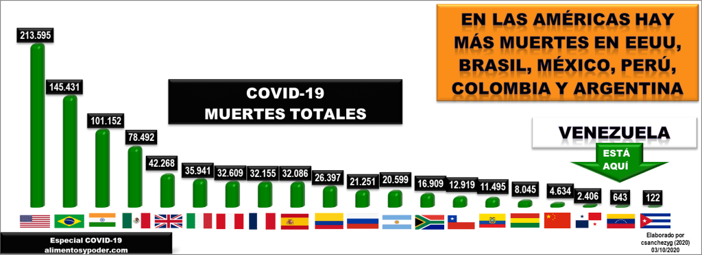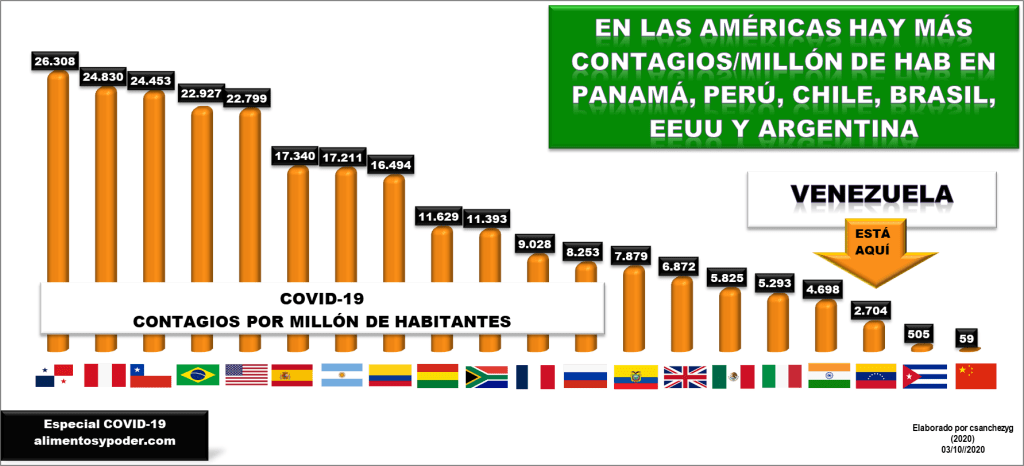 En Venezuela, más allá de los pronósticos fatalistas, apenas se superan los 76.800 contagios totales; mientras que Brasil, se encamina lamentablemente hacia los 5.000.000 de casos, seguido por Colombia y Perú, donde se han contagiado más de 820.000 personas. En Argentina y México, se pronostican los 800.0000 casos.