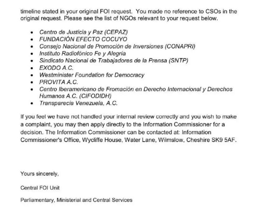 Extracto de la Comunicación 02-2019 del Foreign & Commonwealth Office donde informa del financiamiento a Efecto Cocuyo y Transparencia Venezuela.