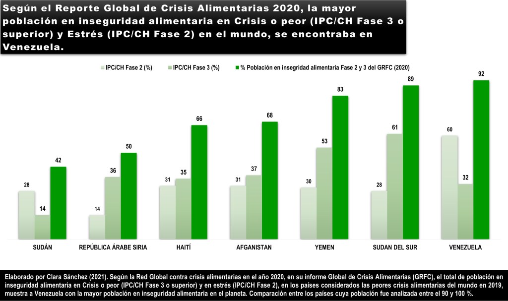En abril de 2020, y como costumbre, a Venezuela nuevamente se le incorporó en el Informe Global sobre las Crisis Alimentarias (GRFC), encontrando las evidencias de un año para otro, y ubicando finalmente al país “como la cuarta crisis alimentaria más grande del mundo con 9,3 millones de personas en situación ‘aguda’ de inseguridad alimentaria”, esto sería con el 32 % de la población en Crisis o peor (Fase 3 de IPC/CH o superior); en un informe con inconsistencias dentro del mismo porque, en otro lado, se puede leer, que son 9,4 millones. Y es que, hasta para la construcción de estas publicaciones cuesta ponerse de acuerdo, o mejor dicho cuesta el consenso.