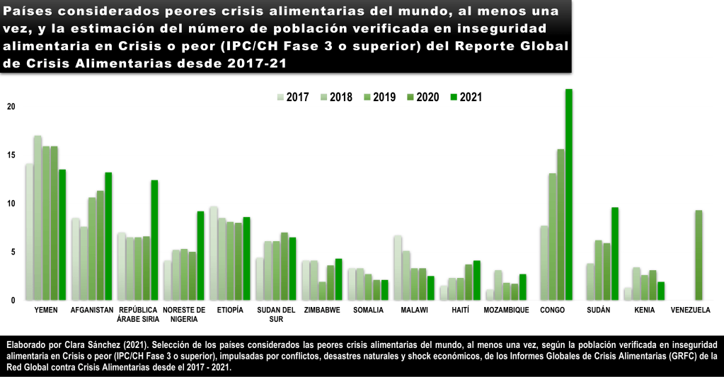 Y aunque, se reporte en el GRFC 2021, que Venezuela fue incluida por una sola vez desde el 2017 – 2021 como crisis alimentaria mundial y, además considerada una de las peores del mundo, puesto compartido supuestamente de ‘única vez’ con la República Democrática Popular de Corea y Sierra Leona, la realidad es que ninguna fue mostrada como una de las peores crisis alimentarias (aun estimándole a la primera 10,1 millones de personas y a la segunda 3,3 millones en inseguridad alimentaria aguda, en el mismo informe 2020), cómo sí sucedió con Venezuela, después de haber sido seleccionada regularmente y año a año, para su inclusión.