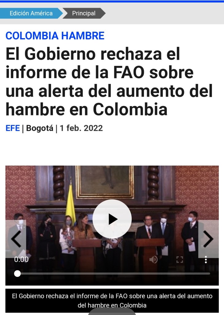 [2] (EFE, 2022) El Gobierno rechaza el informe de la FAO sobre una alerta del aumento del hambre en Colombia. [En línea] 01 de 02 de 2022. https://www.efe.com/efe/america/sociedad/el-gobierno-rechaza-informe-de-la-fao-sobre-una-alerta-del-aumento-hambre-en-colombia/20000013-4729950.