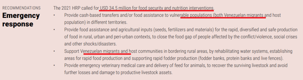 Además, si el informe afirma que 1,1 millones de migrantes venezolanos está en situación de inseguridad alimentaria en Colombia necesitando asistencia; cruda realidad para los que han migrado de Venezuela buscando una mejor vida, que evidentemente no consiguen en ese país; la verdad es que el informe indica son 7,3 millones de personas en emergencia alimentaria, que incluye colombianos y colombianas, mientras el representante de FAO insiste en que “la intención era apoyar a los grupos más vulnerables”[11]: los venezolanos. Bastante injusto para la población nacional de ese país.