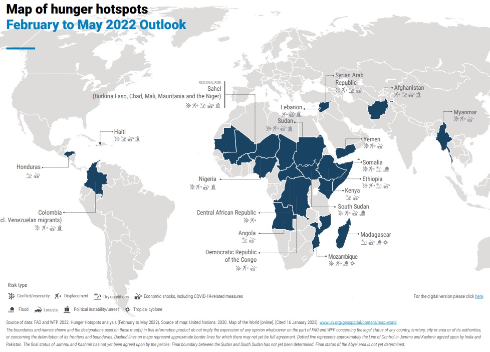 La Organización de las Naciones Unidas para la Alimentación y la Agricultura (FAO) y el Programa Mundial de Alimentos (PMA) publicaron el informe Puntos críticos de hambre. Alertas tempranas FAO-PMA sobre la inseguridad alimentaria aguda. Perspectivas de febrero a mayo de 2022, en el cual se incorporó a Colombia como uno de los países donde “es probable que la inseguridad alimentaria se deteriore aún más en los próximos meses debido a una combinación de inestabilidad política, los desafíos económicos y el impacto de la actual de la crisis migratoria regional, amplificado por el desplazamiento interno”[1] (ver imagen 1)