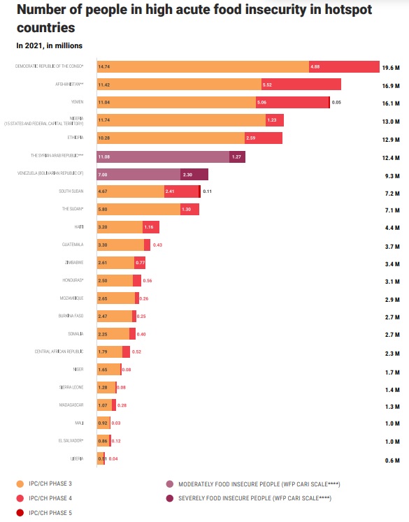 En 2021 a Venezuela se le incorporó tanto en el mapa (ver imagen 11) como en la gráfica (ver imagen 12), según la Escala CARI del PMA, reflejando a la nación dentro de los países con mayor número de personas en situación de inseguridad alimentaria ‘aguda’ en el mundo, aun cuando la población no era considerada en Crisis o peor (IPC/CH Fase 3 o superior), o sea, en inseguridad alimentaria ‘aguda’.