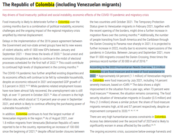 No reflexiona Bojanic sobre el informe, donde se afirma (página 19) que Colombia “según el resumen de necesidades humanitarias de 2022, tiene 7,3 millones de colombianos que sufren inseguridad alimentaria y necesitan asistencia alimentaria” (ver imagen 8) o ¿es que ahora todos serán catalogados de migrantes para poder corregir la publicación, tal como lo pide el Gobierno colombiano?