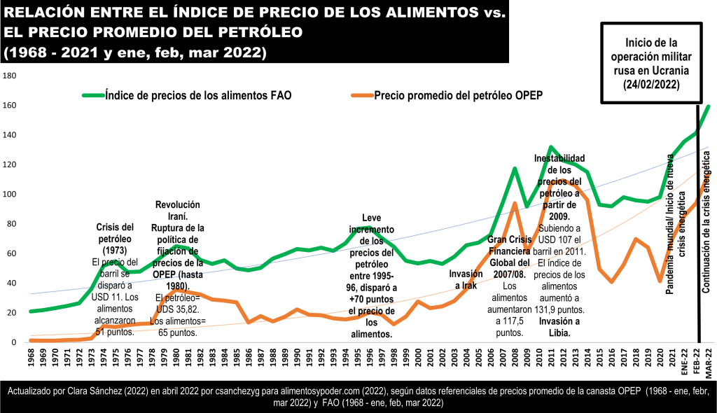Desde entonces, es durante el segundo año de la pandemia mundial por la Covid-19 y el inicio de la nueva crisis energética del 2021, que se registraron uno de los mayores aumentos en el precio del petróleo y, por ende, de los alimentos en un año, correspondiente al 68 % y 28 %, respectivamente, que no paró en enero de 2021. Indicando que, al comienzo del conflicto bélico, se gestaba la nueva crisis alimentaria mundial (ver imagen 1).