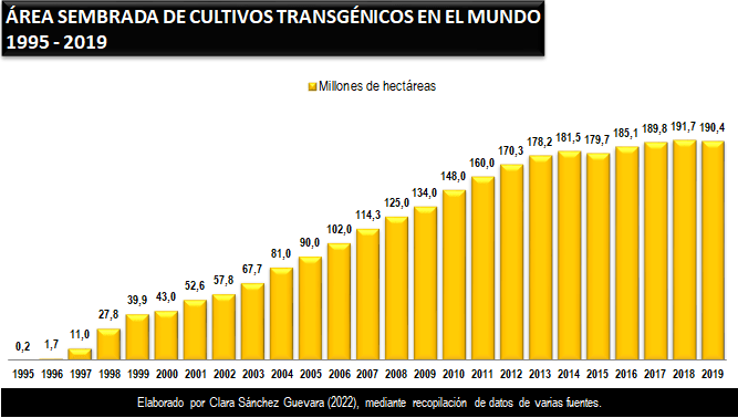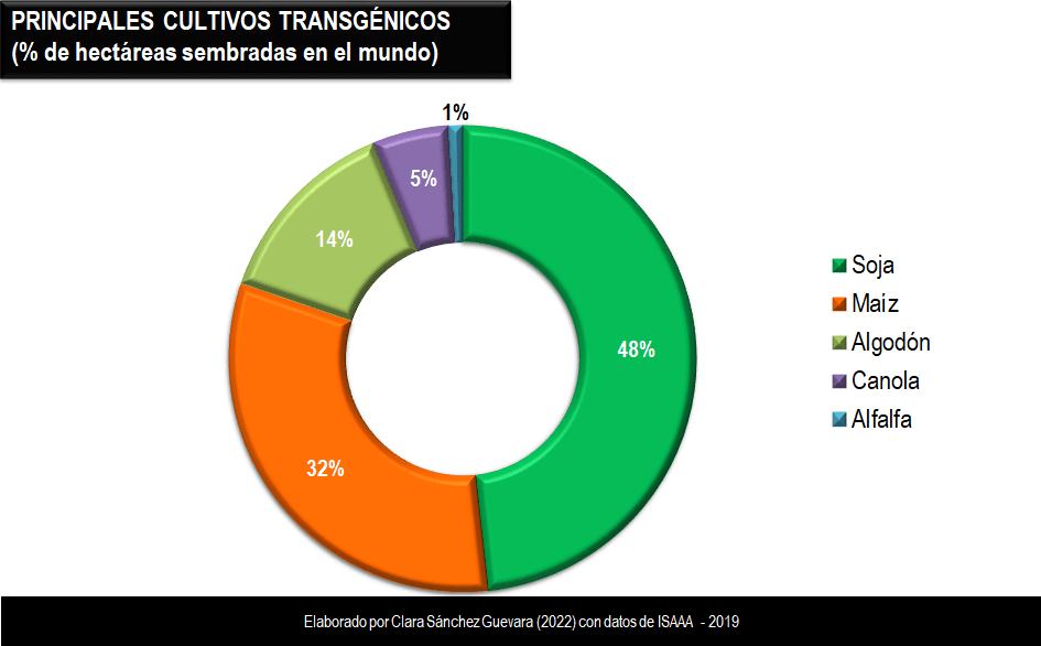 Y son la soja, el maíz, el algodón, la canola y la alfalfa los principales cultivos que ocupan la superficie de siembra transgénica del mundo, que se expande sí a otros cultivos, aunque en muy pequeñas superficies.