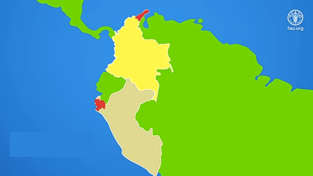 Por lo tanto, es en 2019 que se produce el primer reporte sobre la enfermedad fuera del continente asiático después de 30 años, hacia Medio Oriente, y en agosto se conoció su aterrizaje en el continente Suramericano, específicamente en Colombia (Dibulla y Riohacha) (ver imagen 3), al ser detectado por el Instituto Colombiano Agropecuario (ICA) en 175 hectáreas en diferentes plantaciones de la zona de La Guajira[4], al noroeste de ese país.