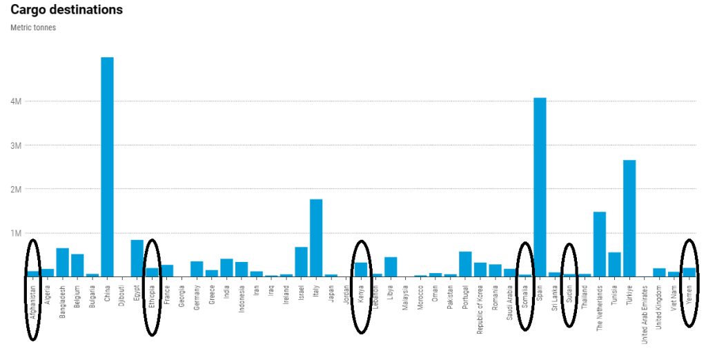 Fueron destinados a los países de ingresos altos, o sea, los que pueden pagar por las materias primas, quienes realmente tuvieron acceso a los granos, permitiéndoles mantener su estatus en el sistema internacional, incluyendo a China. Después ha sido España, Turquía e Italia, los que mayores cargamentos recibieron  a marzo de 2023.