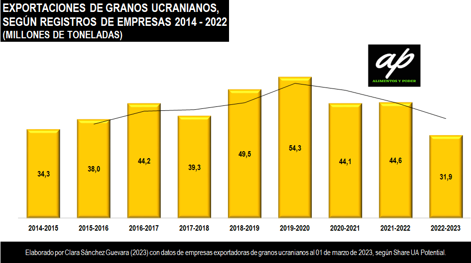 En general, las exportaciones de granos ucranianos alcanzaron las 32 millones de toneladas, disminuyendo de mayo de 2022 a febrero de 2023 en un 28 %, respecto a 2021, e indicando que no solo se exporta a través del corredor humanitario desplegado por la Iniciativa sobre los Cereales del Mar Negro, sino que continúan abiertas otras vías de exportación.