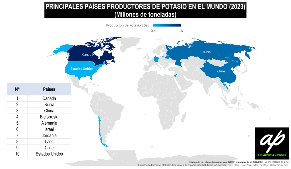 Son Canadá, Rusia, China, Bielorrusia, Alemania, Israel, Jordania, Laos, Chile y Estados Unidos, los diez primeros países donde se produce el 98 % del potasio del mundo.