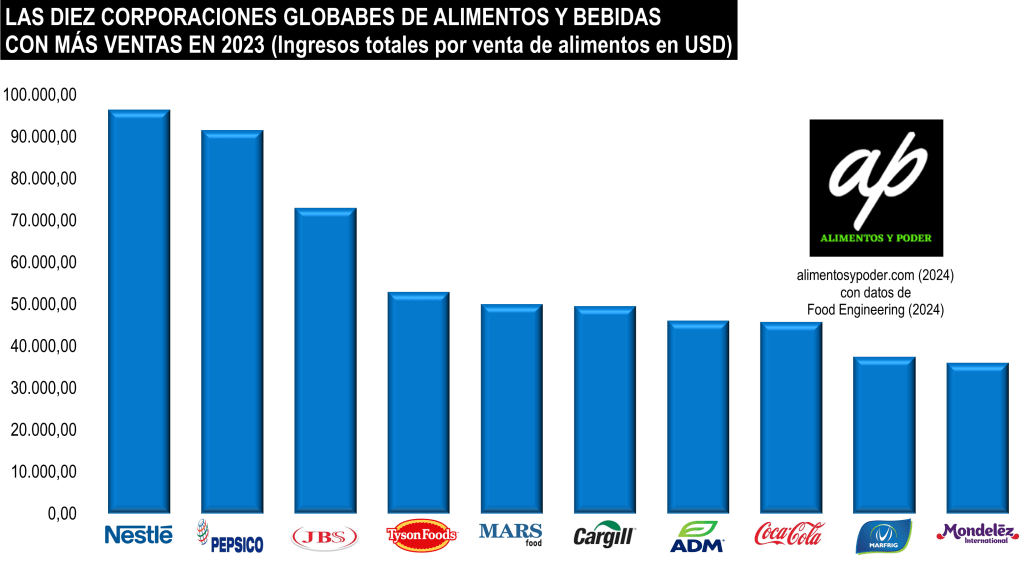 Archer Daniels Miland (ADM), la transnacional de comercialización y procesamiento de granos, aceites vegetales, ingredientes e insumos para alimentos, nutrición animal y biodiesel, también de casa matriz estadounidense, obtuvo ventas en alimentos por 46 mil millones de dólares, posicionándose en el séptimo lugar de estas corporaciones en 2023.