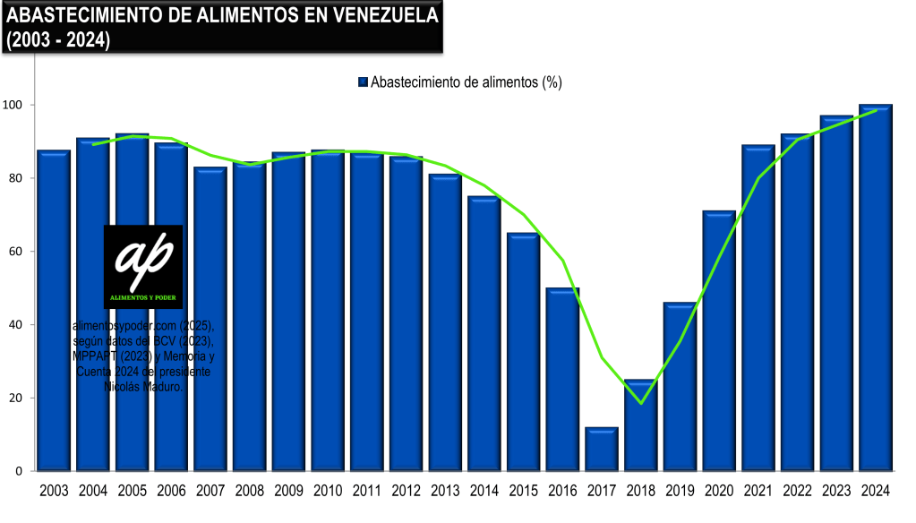 Política pública de lucha contra el hambre en Venezuela que permitió aumentar la disponibilidad de alimentos en más de un 500 % entre 2016 y 2024, esto es 1.378 g/per/día, a punto de alcanzar la media global; además, superando la disponibilidad de energía alimentaria a niveles antes del bloqueo con 3.103 Kcal/per/día y superando otra vez el promedio mundial (ver imagen 5); lo que permitió ampliar el acceso alimentario progresivo y sostenido mediante la recuperación del abastecimiento en 99,1 % a nivel nacional (ver imagen 6).
