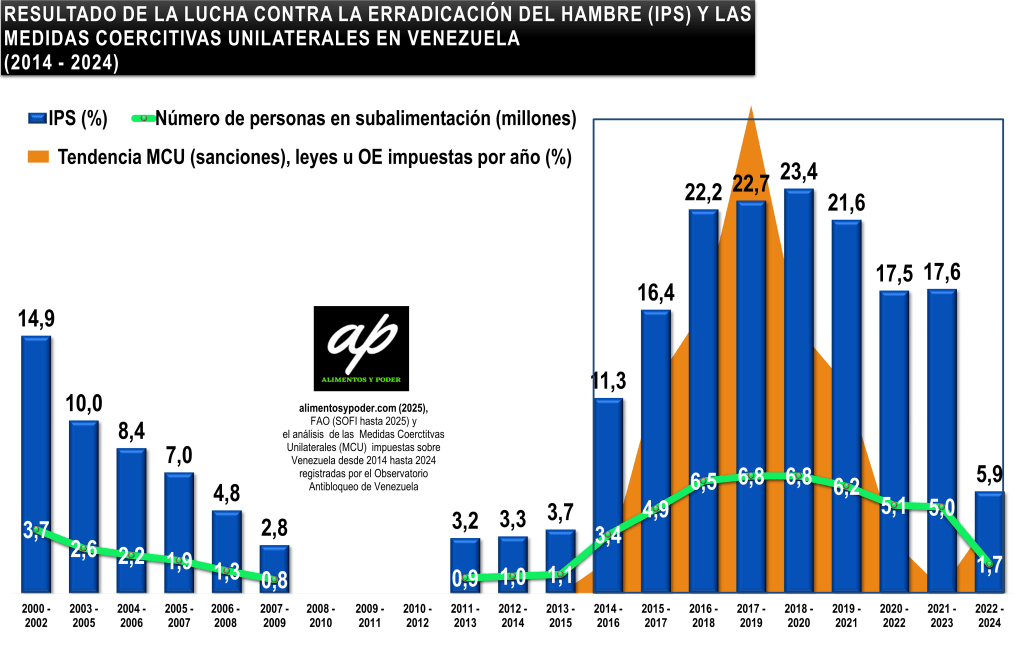 Y es que, a partir de la imposición de las “sanciones” a Venezuela en el año 2014 y después de once años con un lastre de 1041 Medidas Coercitivas Unilaterales (MCU) [2] sobre la República Bolivariana que la ubica entre el quinto y sexto país más sancionado del mundo, dependiendo de la fuente con que se mire, el país ha disminuido nuevamente el hambre que había aparecido en medio del bloqueo económico, financiero y comercial para atacar el poder nacional, como parte de la guerra difusa para ahogar la economía, evitar el suministro de bienes esenciales, entre ellos, los alimentos, impactando negativamente en la seguridad y soberanía alimentaria, por ende, en el pueblo, al que se quería matar de hambre para imponer un fracasado cambio de régimen.
