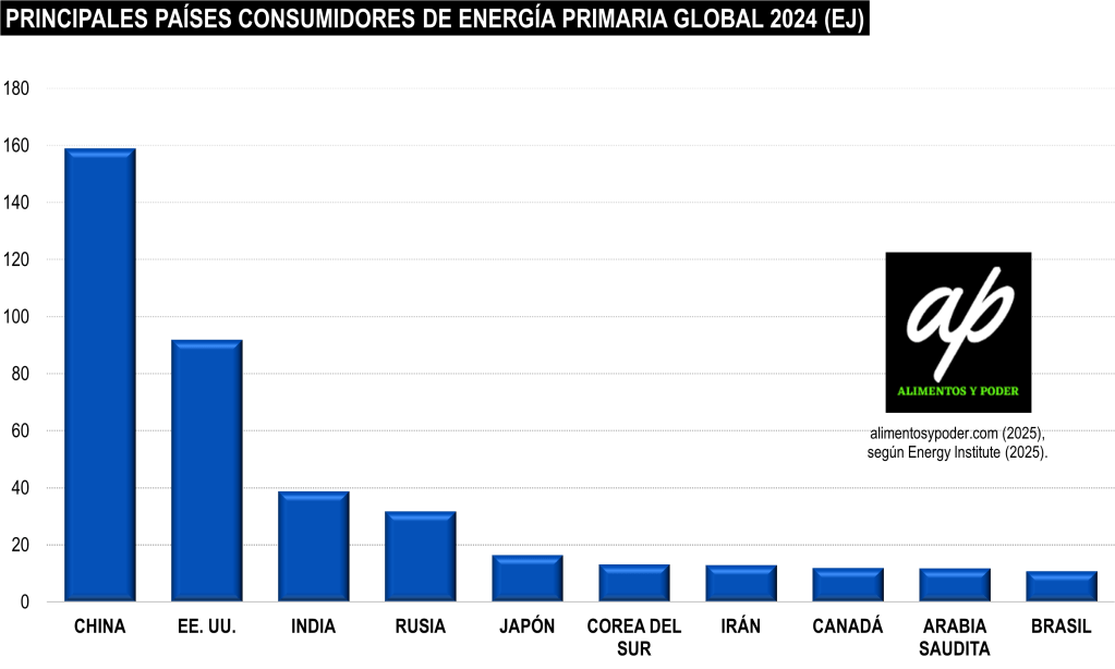 Hasta el 2024, el 67 % del total de la energía primaria global se consume en 10 países, demandando China el 27 % de esta, seguido por EE. UU. con el 15 %.